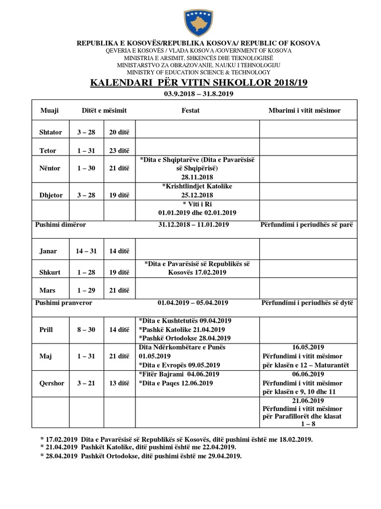 Kalendari Shkollor 2018 2019 Kosove