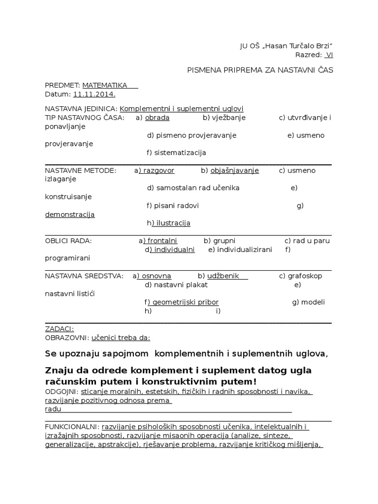 Komplementni I Suplementni Uglovi Nastava Matematike