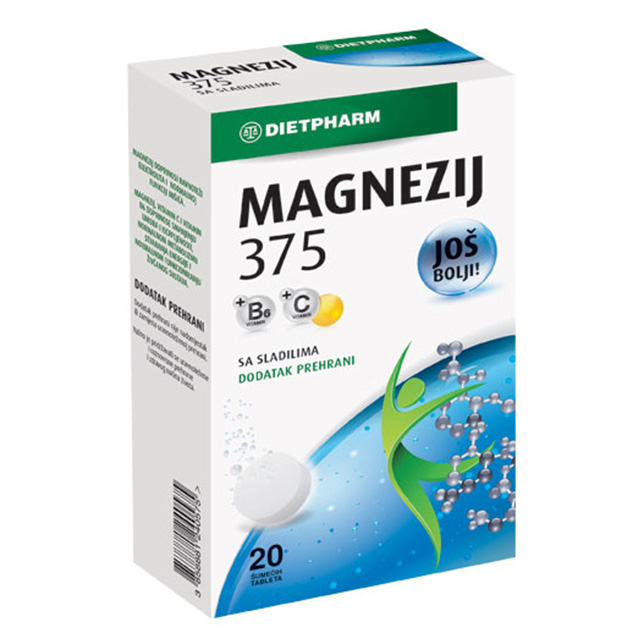 Magnezijum 375 plus b6 je preparat koji sadrži kombinaciju dva aktivna sastojka. Dnevna doza magnezijuma 375 mg u jednoj kesici. Magnezijum 375 plus b6 je kombinacija dva aktivna sastojka.